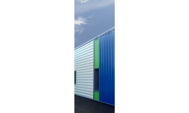 L’ossature et le bardage sont métalliques. Les coloris reprennent ceux de la charte graphique de l’entreprise.