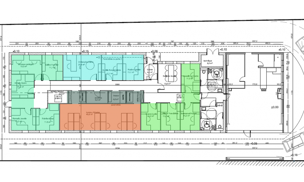 Les trois pôles (direction / études / chantier) s’articulent autour de l’open space dessin. Le noyau dur, espace technique au cœur des bureaux, comprend les imprimantes, la documentation et les archives. Il permet d’éloigner les dessinateurs de la circulation pour plus de tranquillité tout en restant facilement accessibles.